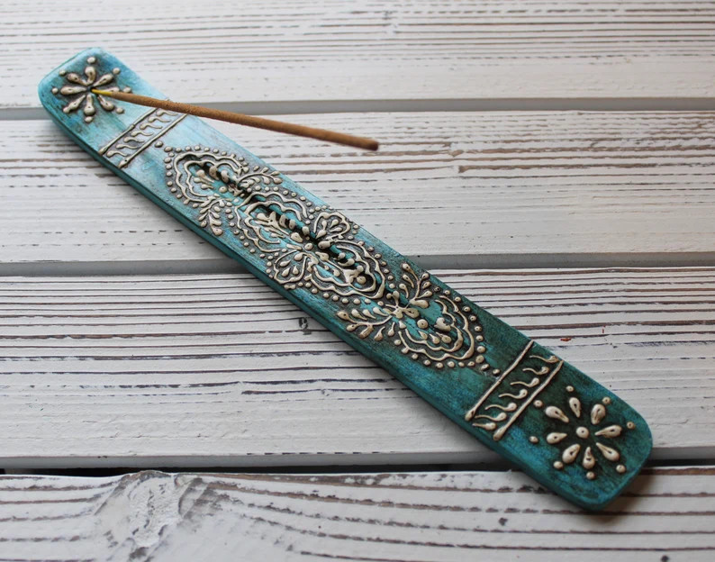 Beautiful and Classic incense holder tray in teal. Gives you a traditional style in your altar or sacred place. This will protect your furniture and home from damage as a wooden ash catcher. This Ash catcher is hand painted and in a unique manner. They can be used with most incense sticks.